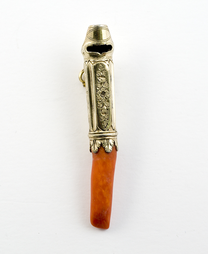 Fysieke beschrijving: Zilveren en vergulde fluit, rechthoekig in 8 verticale banen met om en om geciseleerde decoratie van bloemkopje met bladranken afgewisseld door gladde verticale vlakken. Het fluitje is gebold en is versierd met kleine stippelgraveringen. Inzet naar bijtstuk van bladvormen. Dik bijtstuk van bloedkoraal. Scharnierend haakje aan achterzijde