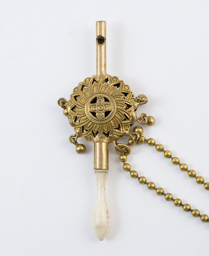 Fysieke beschrijving: Goudkleurige rammelaar in de vorm van een zon, rondom voorzien van oogjes met bolletjes. Aan de bovenzijde een cilindervormige gladde fluit en aan de onderzijde een handvat van ivoor in gladde zetting.