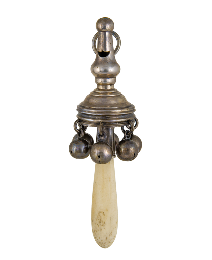 Fysieke beschrijving: Zilveren schermvormige geprofileerde rammelaar met bol fluitje met knopvorm mondstuk en handvat van been. Het licht gebogen scherm heeft rechte geprofileerde randen en zes afhangende bellen.