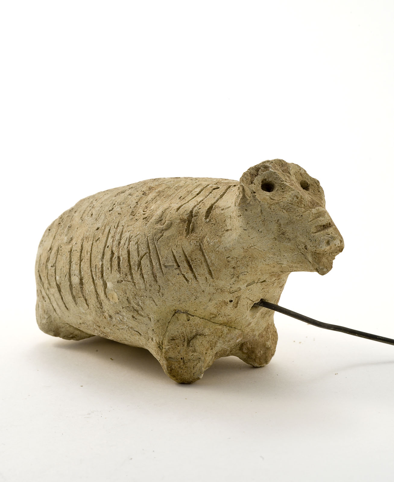 Fysieke beschrijving: Wit aardewerken rammelaar in diervorm op korte pootjes. De bolle buik is voorzien van schuine inkepingen. De kop heeft een platte snuit en twee gaatjes in het hoofd als ogen. Aan de voorzijde voorzien van steel.