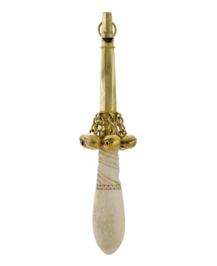 Physical description: Rammelaar van verguld zilver, staafvorm met zeskantige toelopende gladde as met fluitje en ring waaraan zes ogen met 8-vorm haakjes en belletjes. stick van been met diagonale inkervingen.
