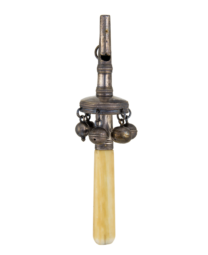 Physical description: Zilveren rammelaar met fluitje, ronde as en ronde schermvorm, het geheel versierd met bandjes. Vijf van de zes bellen waarvan vier verschillende soorten en steel van been.