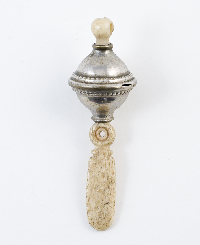 Physical description: Zilveren miniatuur rammelaar met handvat van been. Het lichaam bestaat uit twee halve bollen. Aan de bovenzijde een benen knop met ronde opening.